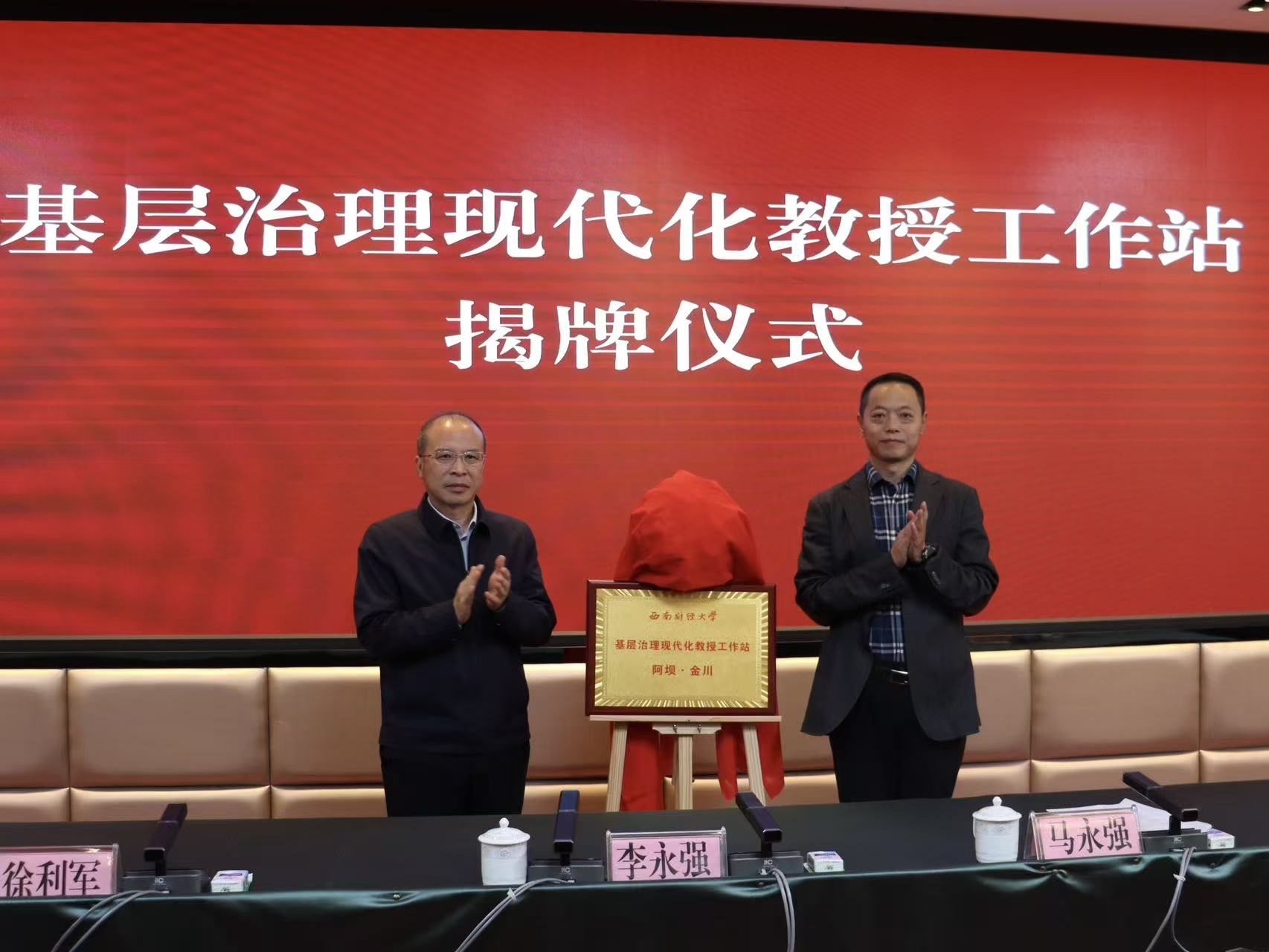 10月23日,由社会发展研究院与中共金川县委社会工作部共建的全国第一个基层治理现代化教授工作站,在学校与阿坝藏族羌族自治州金川县定点帮扶座谈会上正式揭牌。学校党委副书记、校长李永强,党委常委、副校长马永强,国内合作与发展处处长徐利军、研究院党委书记岳敏、社会工作专业师生代表,金川县委副书记、县长史志刚,县委常委、县委办主任余璐,副县长叶枫,社会工作部等县级相关部门负责人参加。李永强和史志刚共同为基层治理现代化教授工作站授牌。