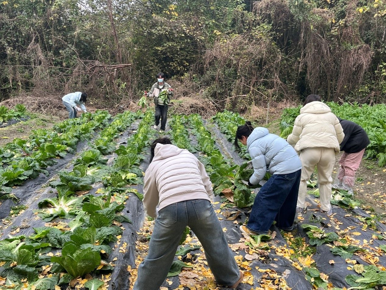 2025年12月9日,柳林校区“耕读田园”劳动实践基地迎来大丰收。社会发展研究院“耕读田园”第二课堂的学生在“南野”开展集中采摘活动,并在“SWUFE 劳动集市”设立展销摊位,将亲手种植的新鲜白菜推向校园市场。